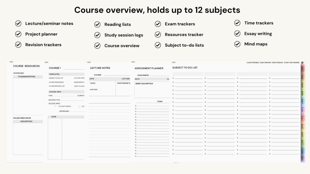 - Holds up to 12 courses/subjects - each of the courses has 12 academic templates for better organisation